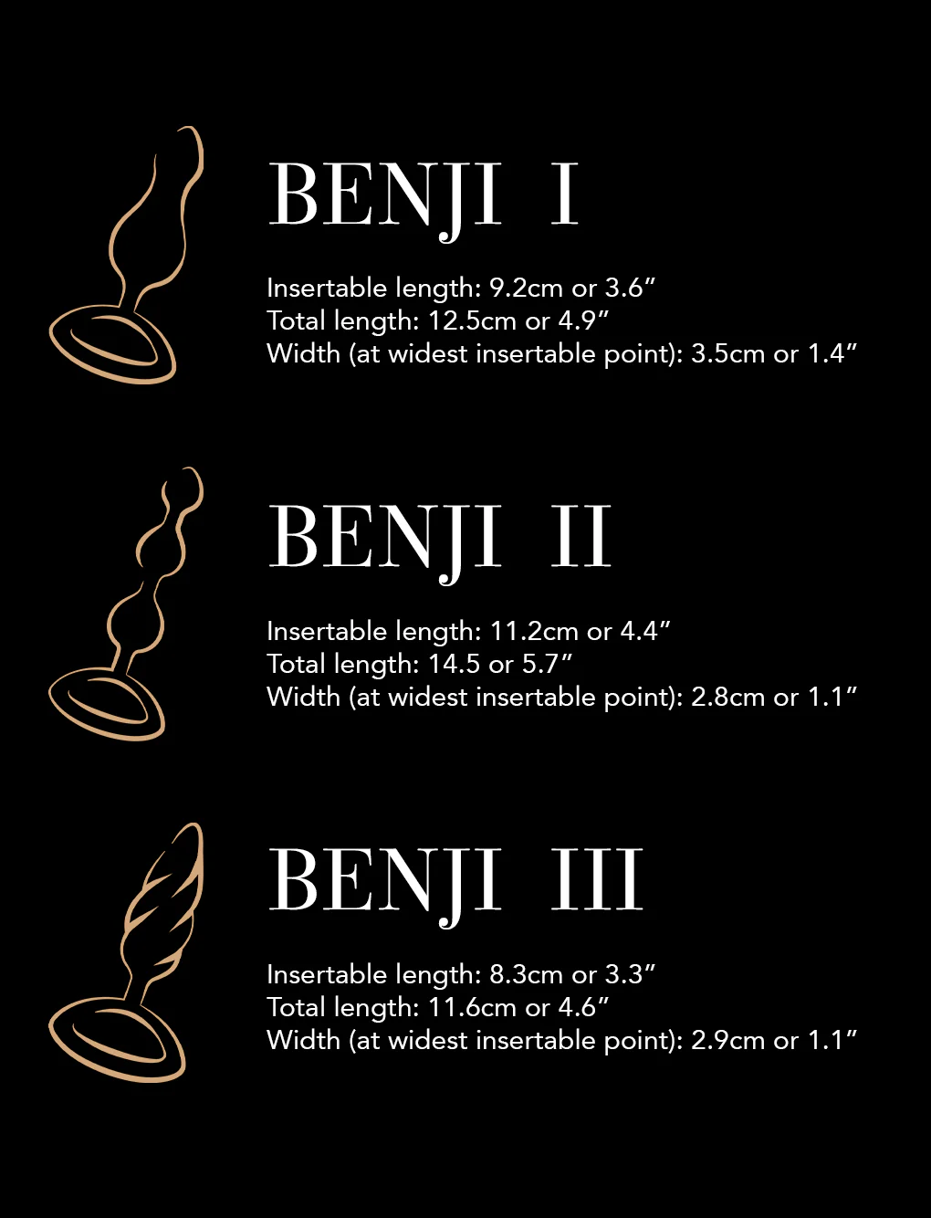 Introducing the ultimate threesome. Explore new pleasures with the Benji tush toy trio. Including three different plugs in sensational shapes, each is designed to spoil the derrière and feel comfortable to wear. Whether you wear them alone or pair up with a partner, this booty-full pleasure set will ensure a happy ending!